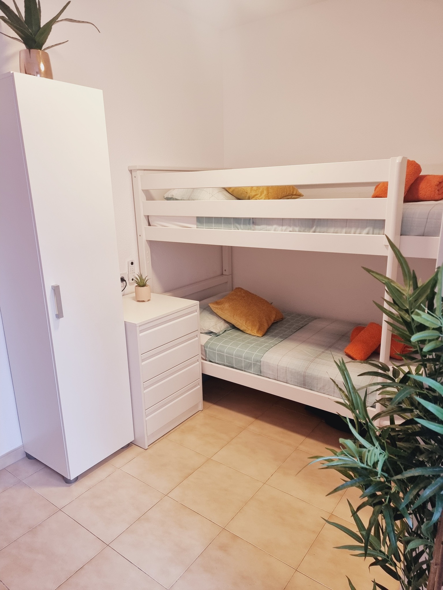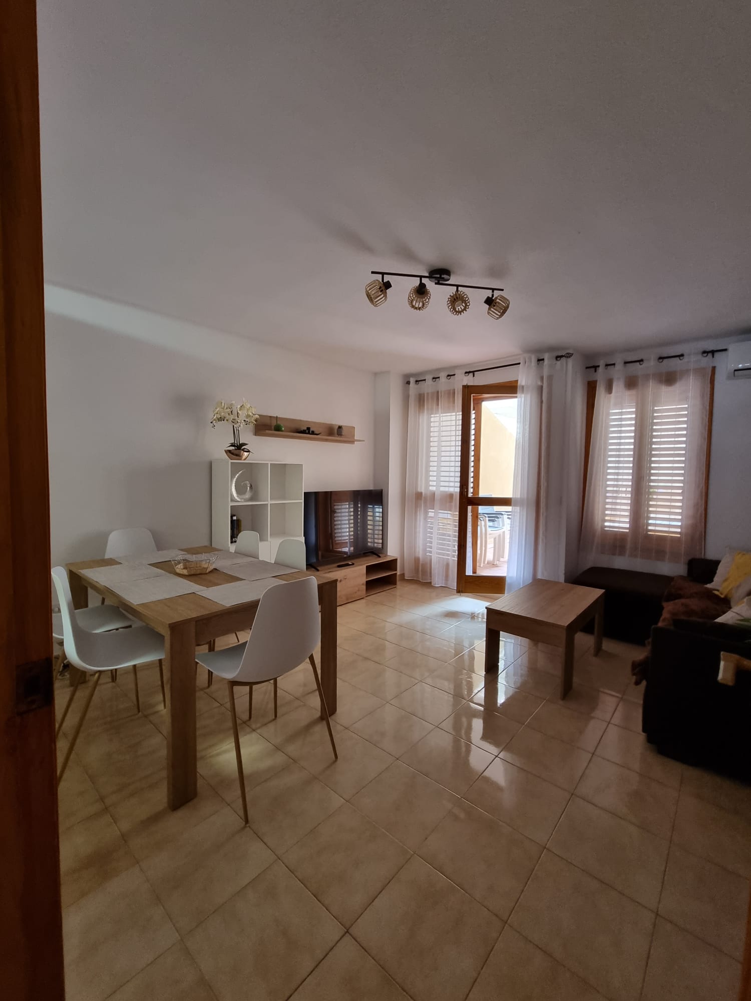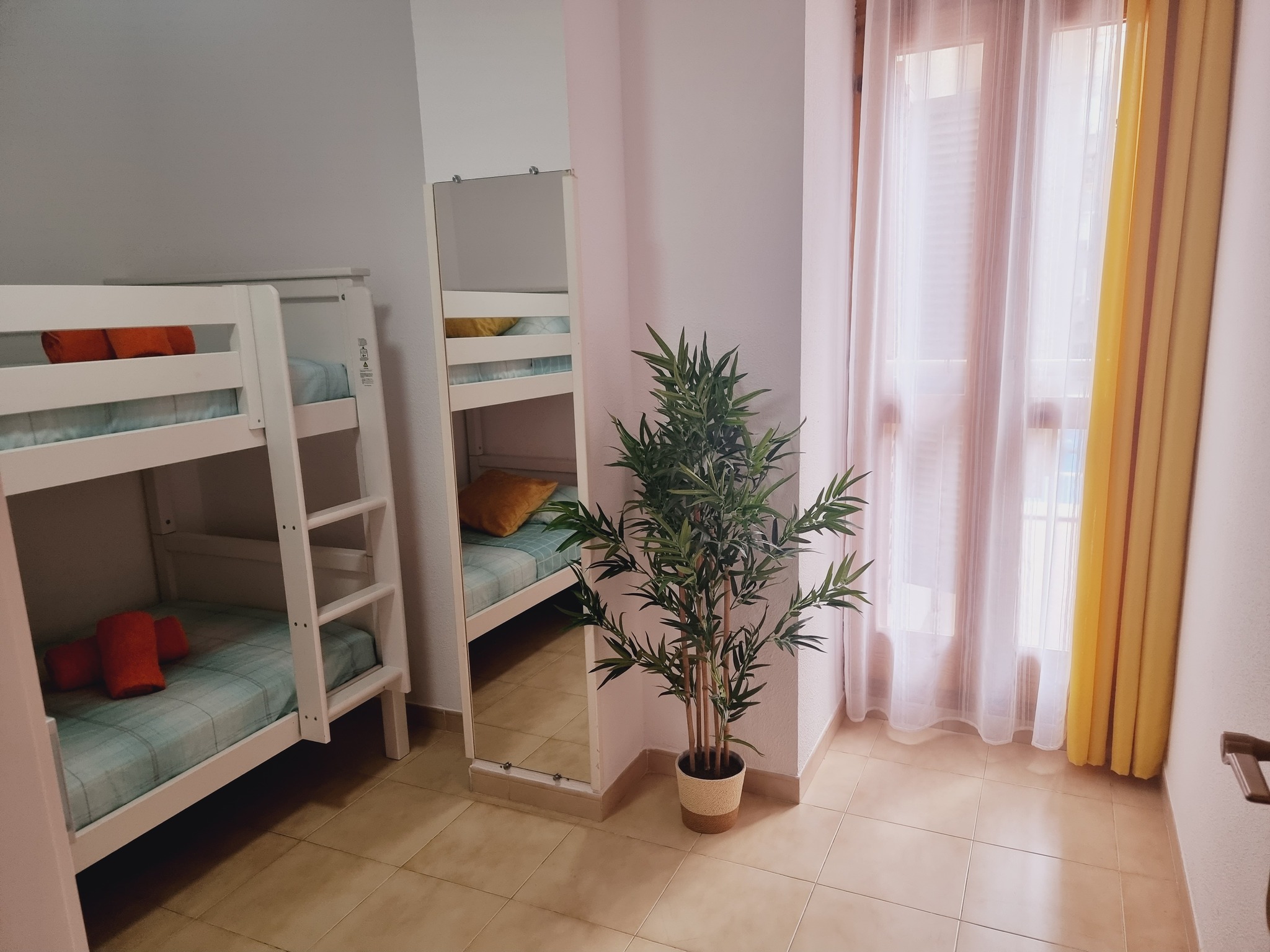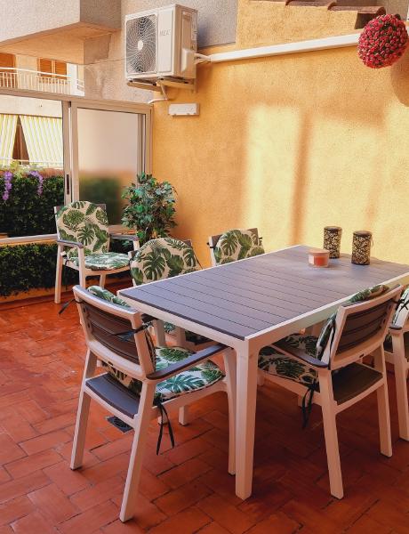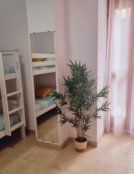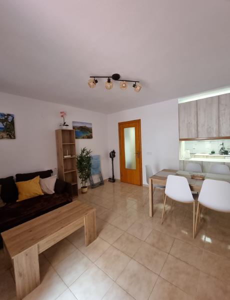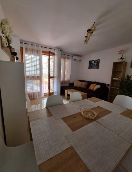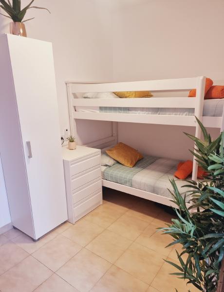 Inside, the apartment has been thoughtfully decorated to create a bright and welcoming space. The living room is airy and modern, with a dining area for family meals, a comfortable sofa bed for relaxing, and direct access to a spacious terrace where you can enjoy the sunshine. There are two bedrooms: one with a double bed and another with bunk beds, making it perfect for families or friends travelling together. With the sofa bed, up to six people can stay comfortably.